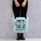 Introducing a spacious and stylish tote bag, adorned with a subtle touch of wit, designed to facilitate the transportation of essential items.